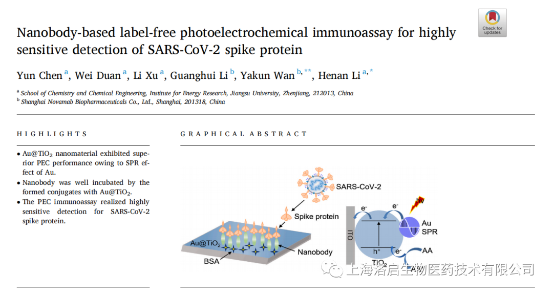 2022年5月3日,mksport官网生物和江苏大学化学化工学院李赫楠教授团队合作,在《Analytica Chimica Acta》发表了题为“Nanobody-based label-free photoelectrochemical immunoassay for highly sensitive detection of SARS-CoV-2 spike protein”的研究论文。mksport官网生物万亚坤博士和李贺楠教授为并列通讯作者,相关纳米抗体的知识产权归mksport官网生物所有。