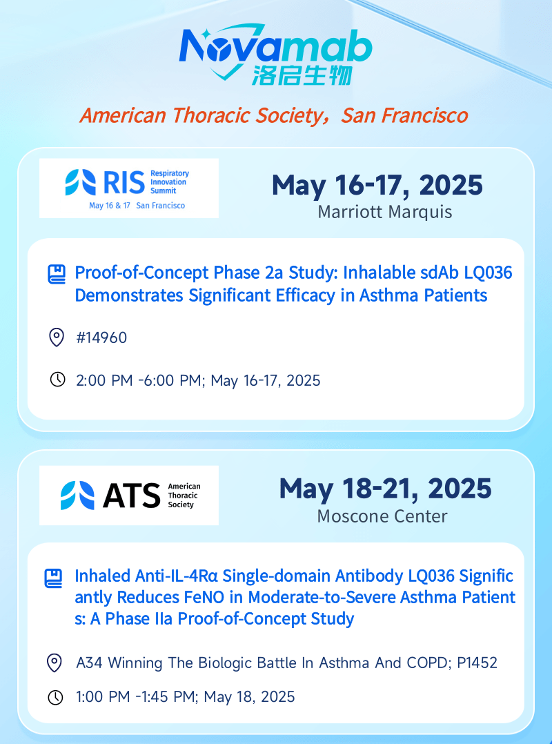 中国上海,2025年5月13日——上海mksport官网生物医药技术有限公司,一家专注于纳米抗体创新药研发的生物技术企业,今日宣布:mksport官网生物将于当地时间5月16日至21日赴美国加州旧金山,受邀参加美国胸科学会(American Thoracic Society, ATS)主办的呼吸创新峰会(Respiratory Innovation Summit,RIS)及ATS国际大会。届时mksport官网生物将分别在RIS和ATS两场大会上以壁报形式呈现最新临床数据——公司自主研发的靶向 IL-4Rα 吸入性生物制剂 LQ036 首个 IIa 期概念验证性临床试验数据。本次展示将全面披露 LQ036 在中重度哮喘患者中的安全性、耐受性、药效指标及初步疗效,标志着mksport官网生物在下一代呼吸道吸入式生物制剂开发领域迈出关键里程碑。